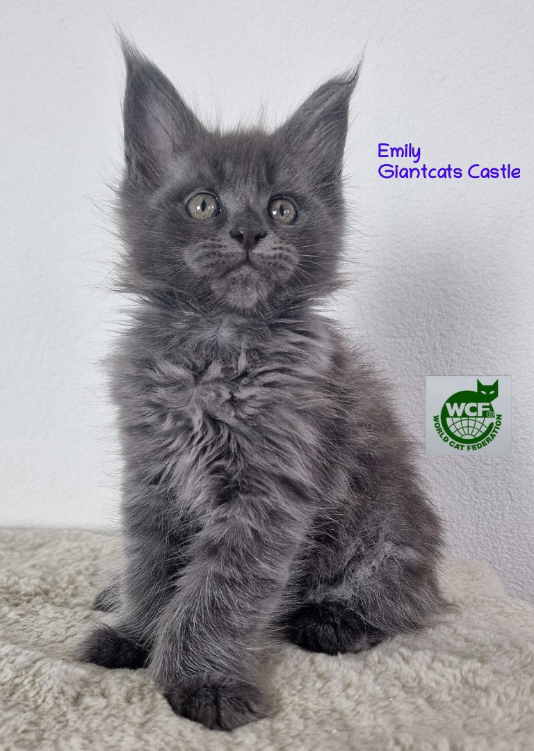 ich bin Emily von Giantcats Castle – ein Maine Coon Madel von sehr großen kräftigen Maine Coon Eltern aus alten prämierten Zuchtlinien! Unsere Stammbäume sind von der World Cat Federation (WCF) zertifiziert.