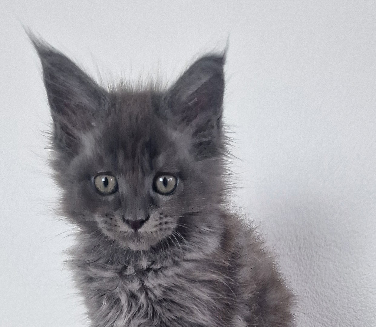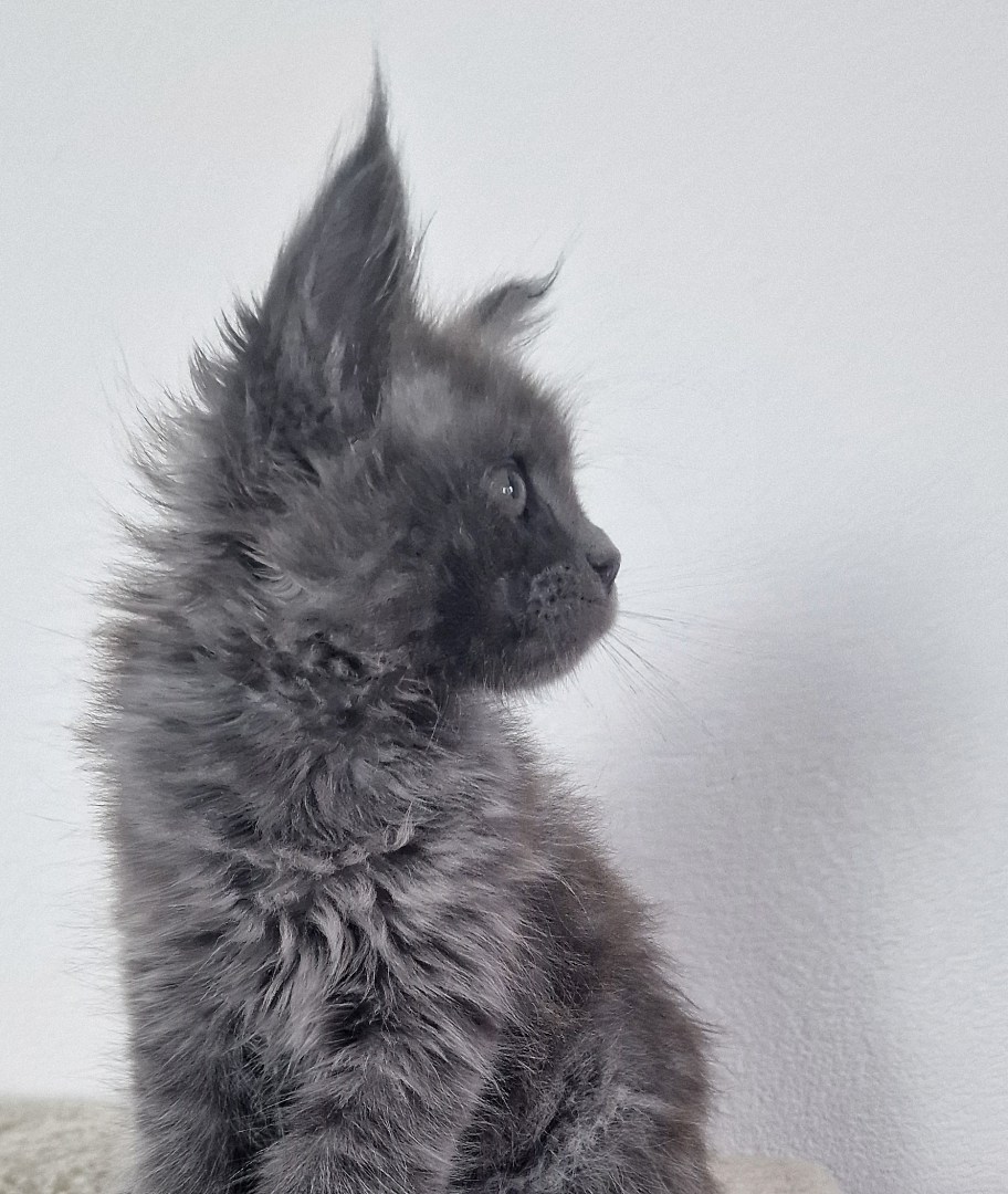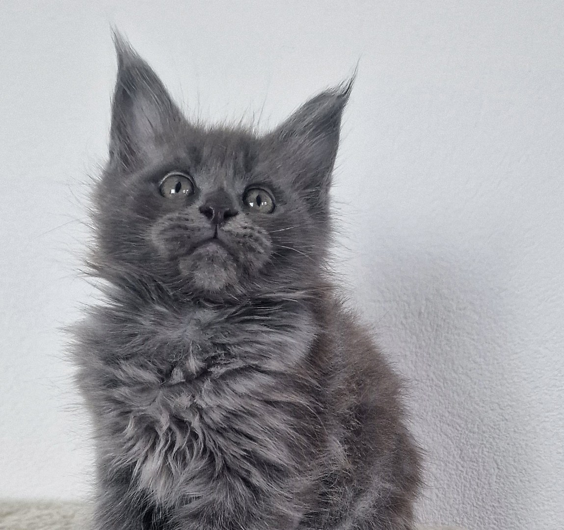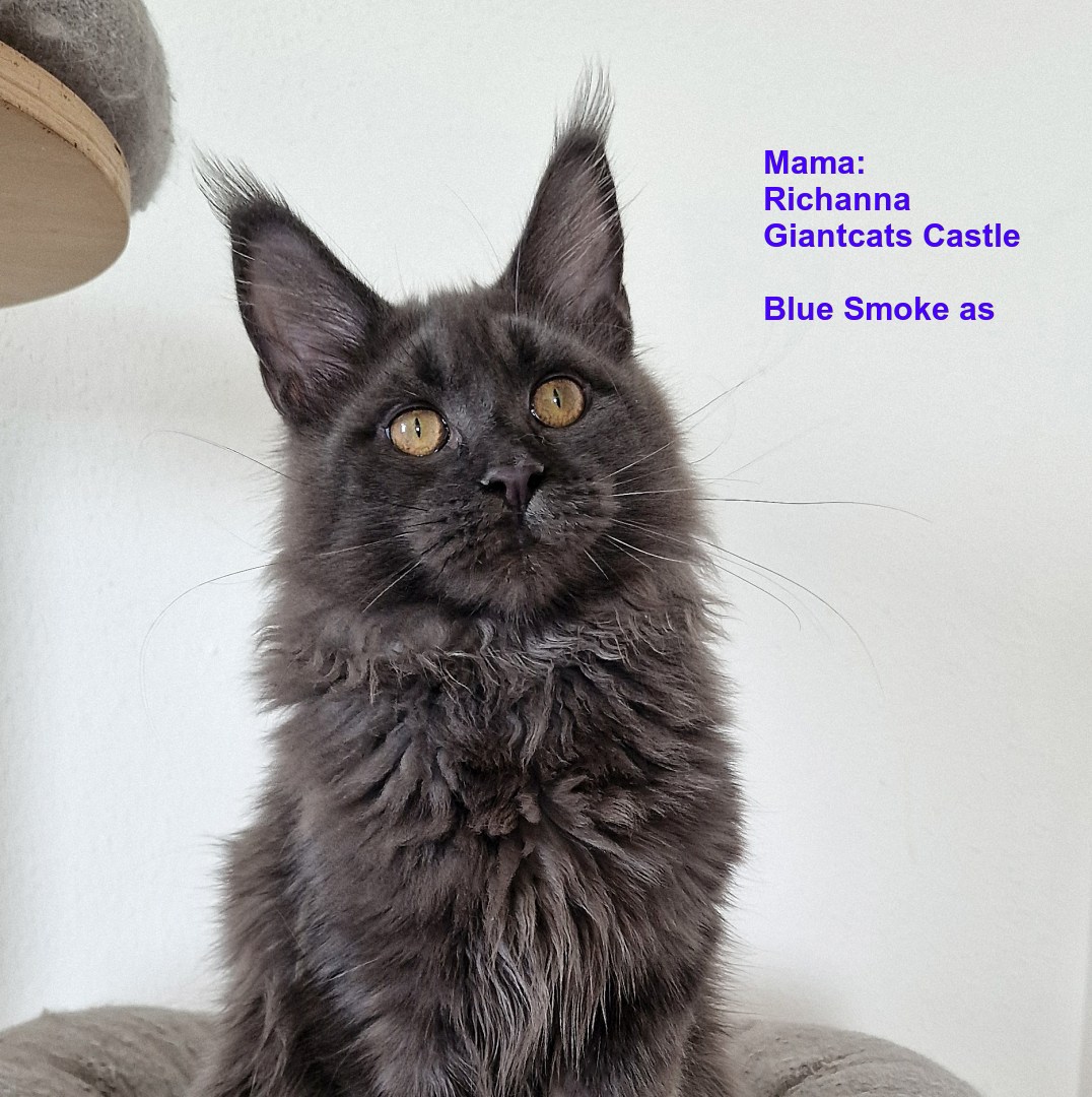 Ich wurden am 30. Mai 2025 geboren, bin kerngesund, kräftig und jetzt schon besonders groß. Meine Gesundheit ist durch Gentests und Blutanalysen meiner Eltern belegt und ich bin sehr stolz auf mein Aussehen – meine beiden Geschwister und ich sind seltene, zertifiziert reinrassige Schönheiten in Blue Smoke 🙂 Das bedeutet, die Grundfarbe ist Dunkelgrau mit viel Silber.